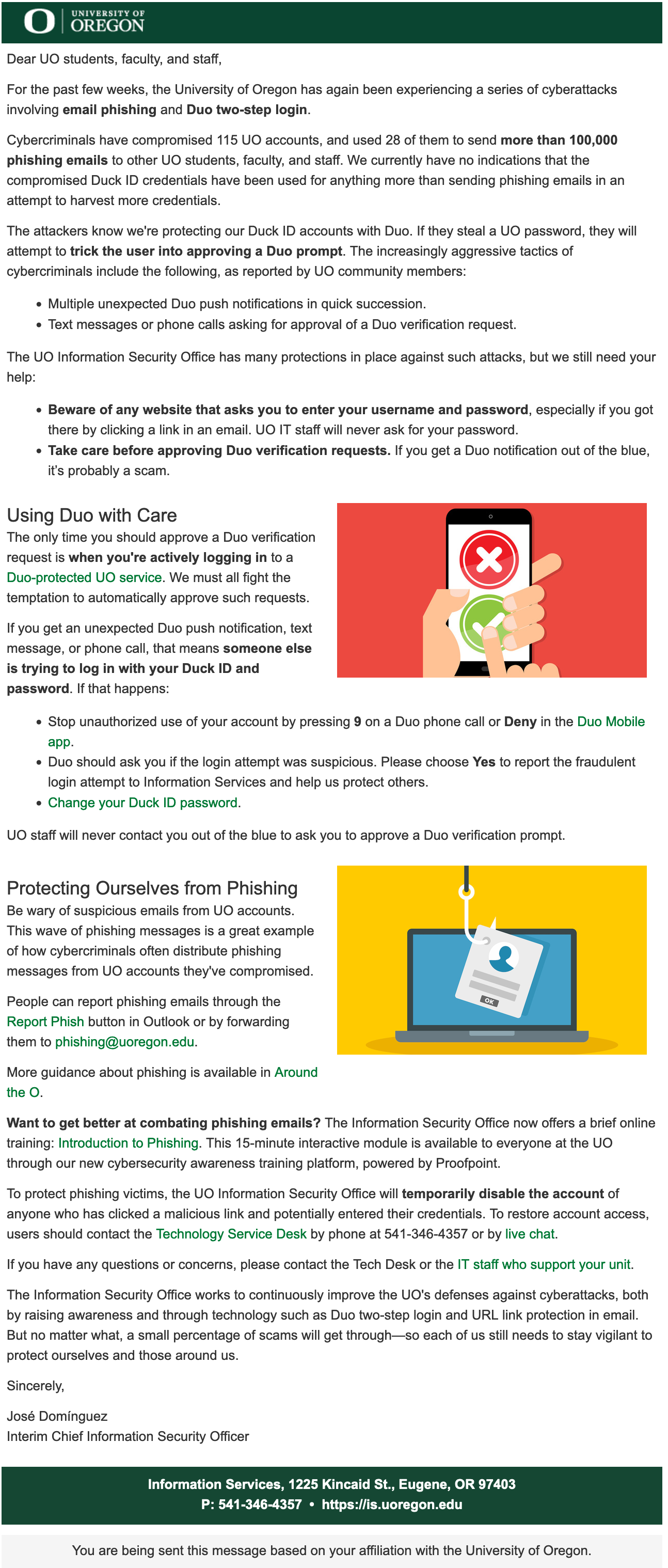 Be wary of suspicious emails from UO accounts. This wave of phishing messages is a great example of how cybercriminals often distribute phishing messages from UO accounts they've compromised.