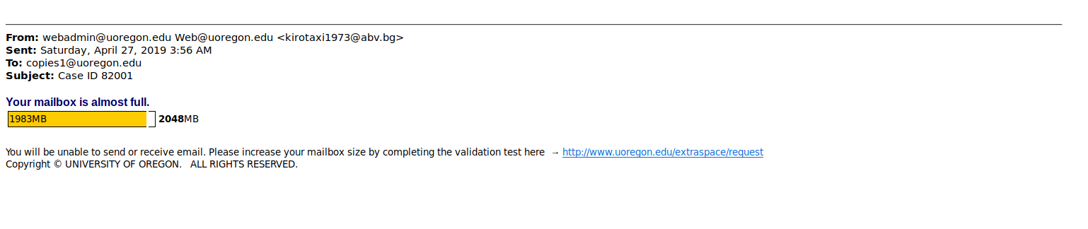 You will be unable to send or receive email. Please increase your mailbox size by completing the validation test here ? http[:][//]www[.]uoregon[.]edu[/]extraspace[/]request