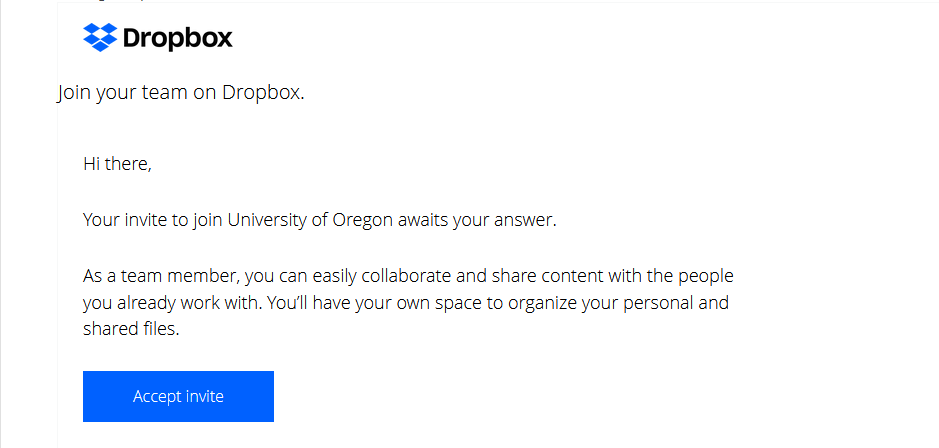This is a legitimate email from Dropbox. Many users all over campus received this email earlier last week.