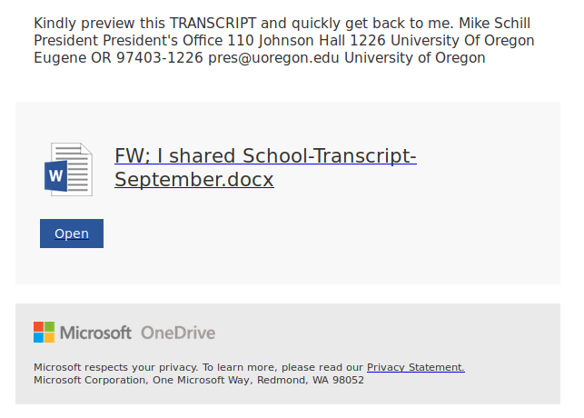 Kindly preview this TRANSCRIPT and quickly get back to me. Mike Schill President President's Office 110 Johnson Hall 1226 University Of Oregon Eugene OR 97403-1226 pres@uoregon.edu University of Oregon